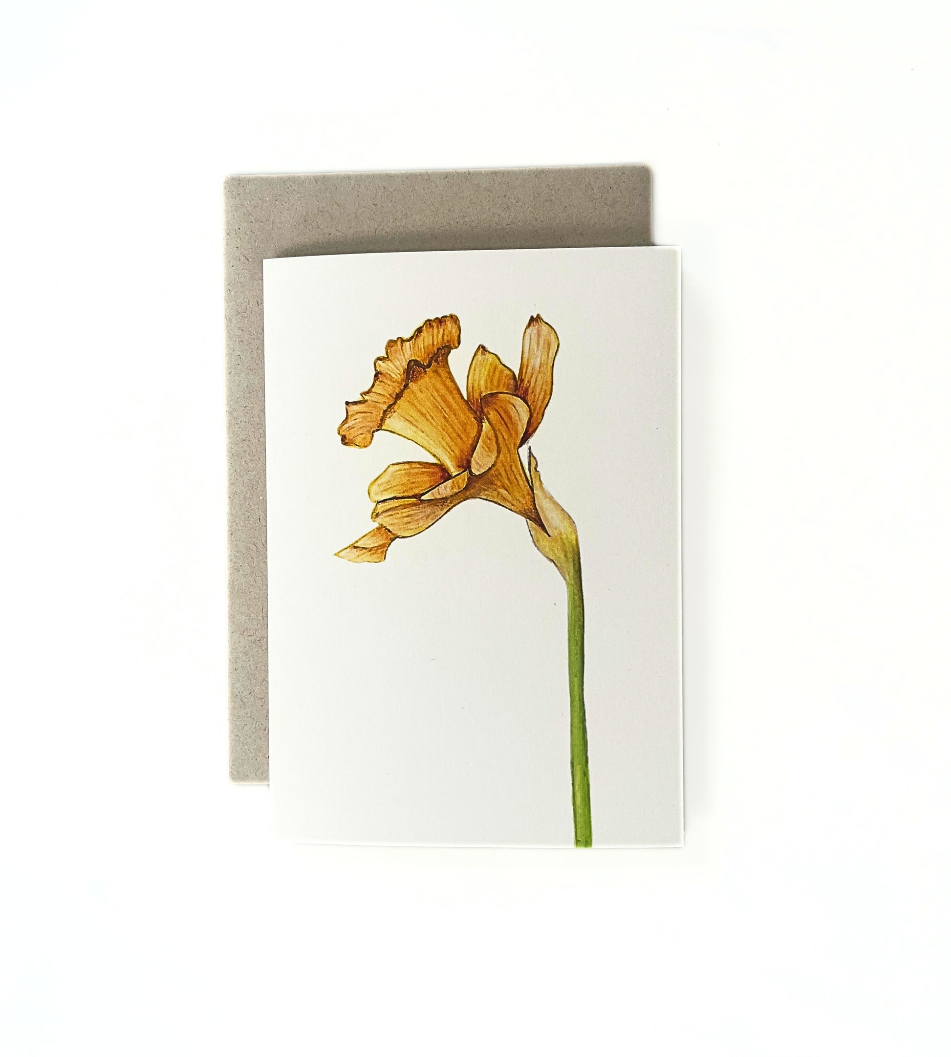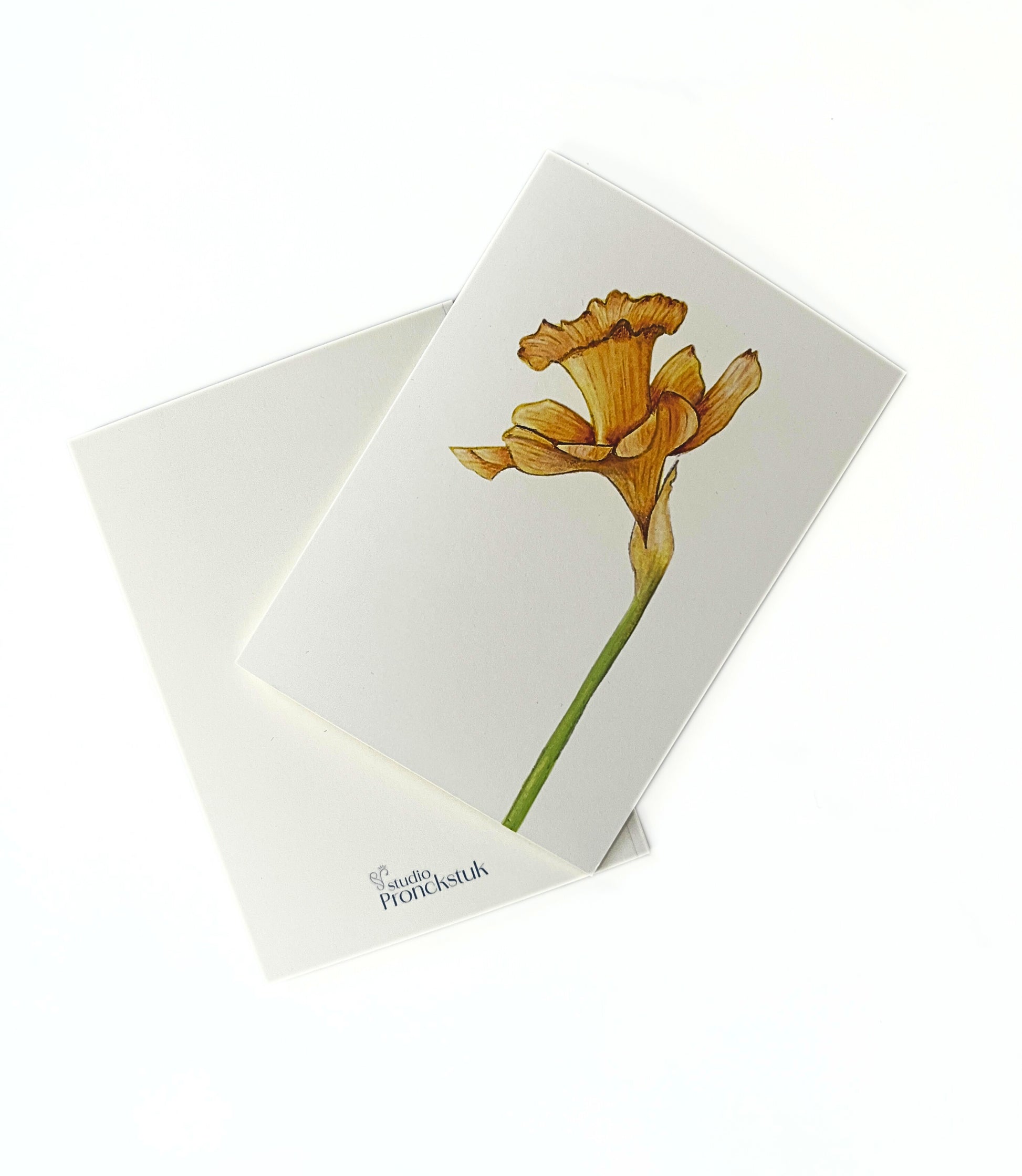 Als ik de eerste narcissen zie dan weet ik: het voorjaar is nu écht in aantocht. De heldere gele bloemblaadjes van de narcis openen zich als een teken van een nieuw begin. De delicate lijnen en frisse kleuren brengen een gevoel van hoop, vernieuwing en optimisme over. Een bloem die het onverwachte verlicht en de kracht van groei in de meest pure vorm toont. Je kunt de kaart mooi neerzetten in een van de kaartenhouders.